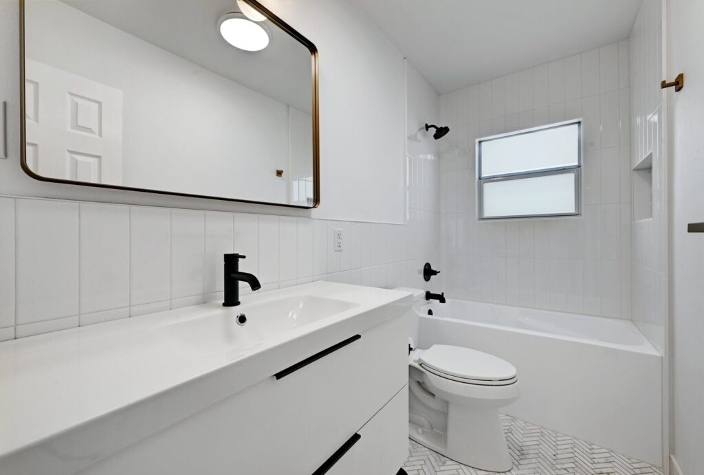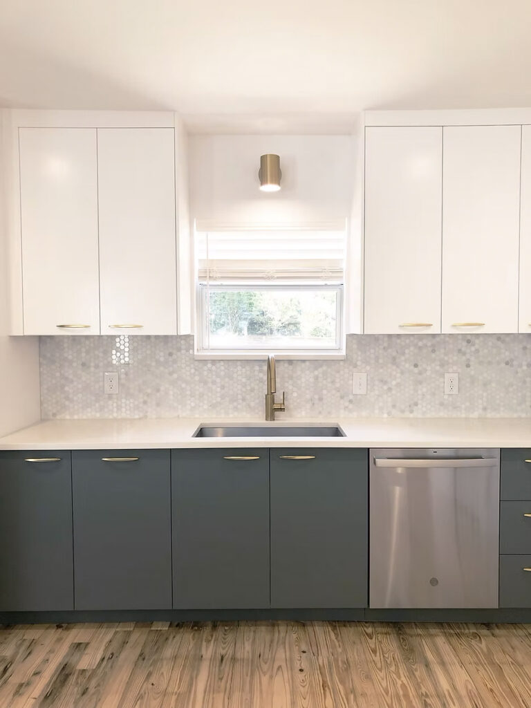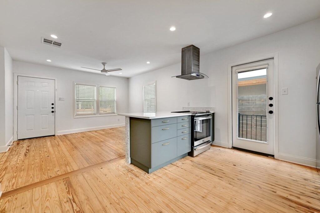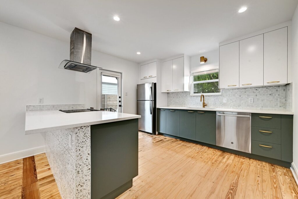 This 1959 Central Austin home packs a lot of charm into a small footprint. We re-imagined the main living space to create a large, open concept kitchen with bar seating and plenty of room for entertaining. Waiting underneath layers of linoleum and carpet were the amazing original heart pine floors – a very unusual feature for a house of this age! The floors were lovingly restored, and now they provide a warm backdrop for the home’s modern touches including quartz countertops, marble tile, brass fixtures, high-end appliances and a fresh color palette.